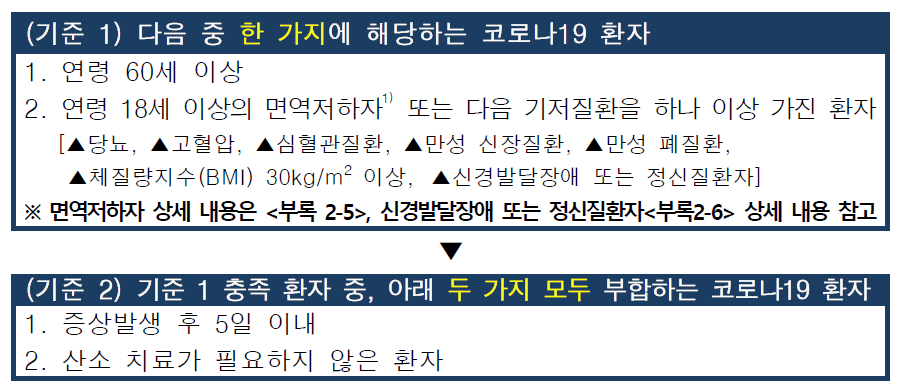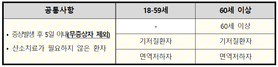 • 증상 발생 후 5일 이내 투여 가능, 무증상자는 투여대상이 아님