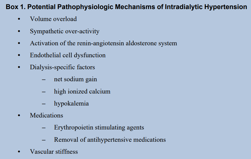 투석 중 고혈압의 발병 기전은 아직 명확히 규명되지 않았습니다. 여러 요인들이 원인으로 제안됩니다. (아래 box 1)