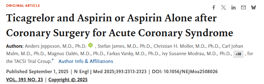급성 관상동맥 증후군에 대한 CABG를 받은 환자 중에서, Ticagrelor + 아스피린이 아스피린 단독에 비해 1년 시점에 사망, 심근경색, 뇌졸중 또는 재관상동맥 재관류술의 발생률을 낮추지 못하였습니다.